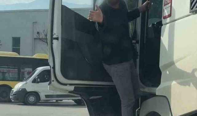 Bursa'da bir otomobil sürücüsü kavşağa hızla girdiği iddia ettiği tır sürücüsüyle tartışma yaşadı "Sen katil misin, nasıl bir hızla gidiyorsun?" diye tepki gösterdi. Tır sürücüsü trafikte aracından inip otomobil sürücüsünün üzerine yürüdü. Otomobil sürücüsü aracını kilitleyip o anları kayda aldı. Kavşakta duran tır sürücüsü aracına binerken el hareketi de yaptı.