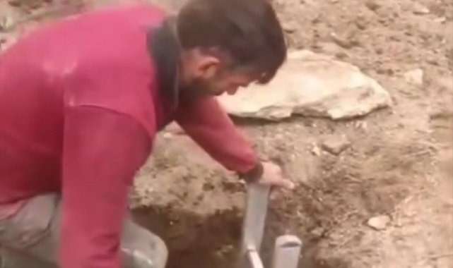 Sarıkaya ilçesine bağlı Burunkışla köyünde çiftçilik yapan Kamil Bayar'ın nohut ekimi yaptığı sırada traktörünün bıçağına taş takıldı. Takılan taşı kaldırırken taşın altında sığınak benzeri bir çukur olduğunu keşfetti. Bu anları cep telefonu kamerasıyla görüntüledi.