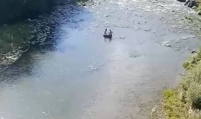 Tokat'ın Reşadiye ilçesinde iki arkadaş traktör şambreli ile Kelkit Çayı'nda 10 kilometrelik rafting keyfi yaşadı.