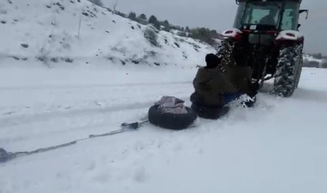 Olay, Eskipazar ilçesine bağlı Bölükören köyünde meydana geldi. Kar yağışıyla birlikte beyaza bürünen köy yollarında karın keyfini çıkarmak isteyen iki genç, traktörün arkasına iple bağladıkları eski araç lastiklerine oturarak kayak yaptı. Karla kaplı yolda hızla ilerleyen traktörün arkasında kayan gençler, eğlenceli halleriyle renkli görüntülere sahne oldu.