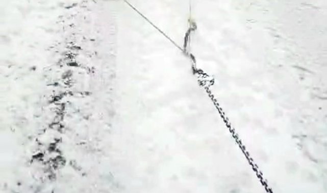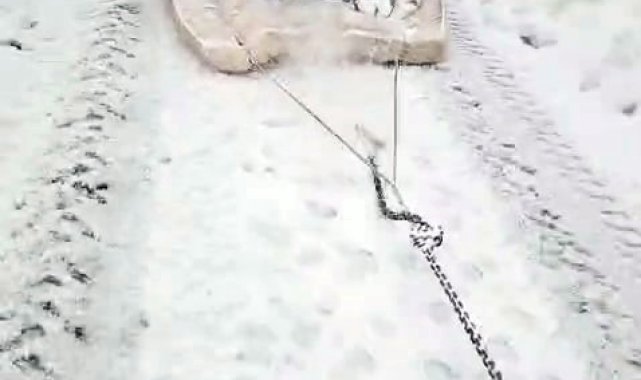 Sakarya'nın Akyazı ilçesinde 2 kişinin traktörün arkasına bağladıkları yatakla karda kaydığı anlar cep telefonu kamerasına yansıdı.