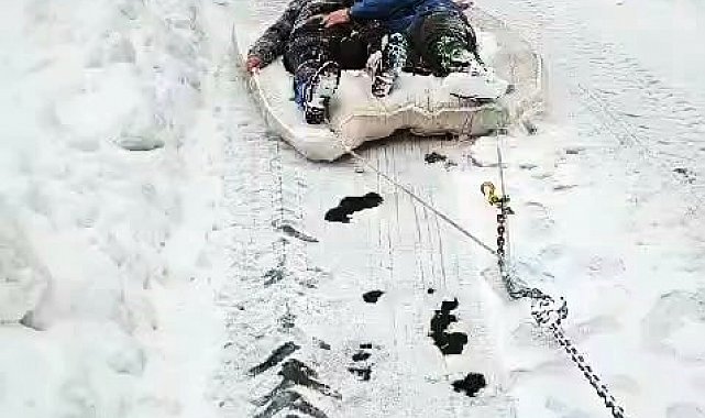 Traktörün arkasına bağladıkları yatakla karda kaydılar