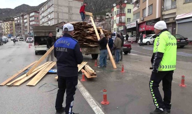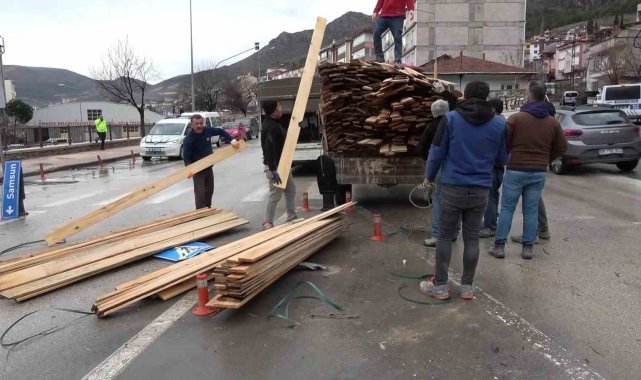 Amasya'da tünel çıkışı kavşaktan dönen traktörün römorku yan yatarak devrilirken, römorktaki keresteler yola dağıldı. Arkadaşlarının yardımına yetiştiği sürücü, "Verdiğimiz rahatsızlıktan dolayı özür dileriz" dedi.