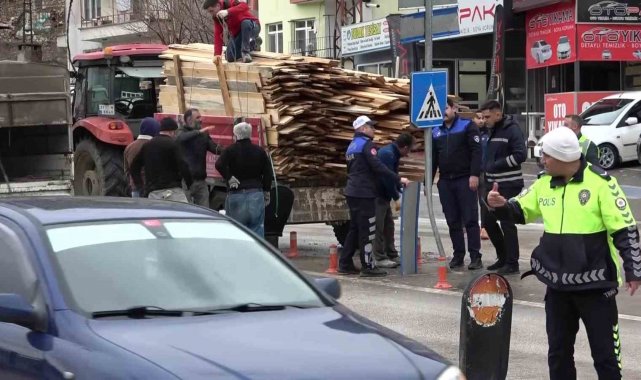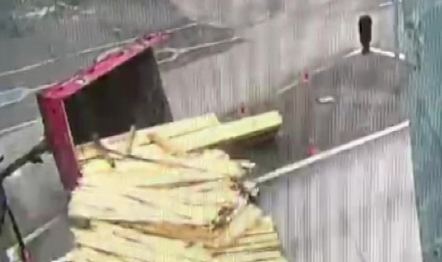 Traktörün devrilen römorkundaki keresteler yola dağıldı: O anlar kamerada