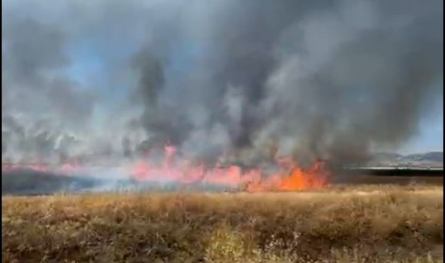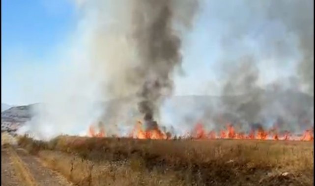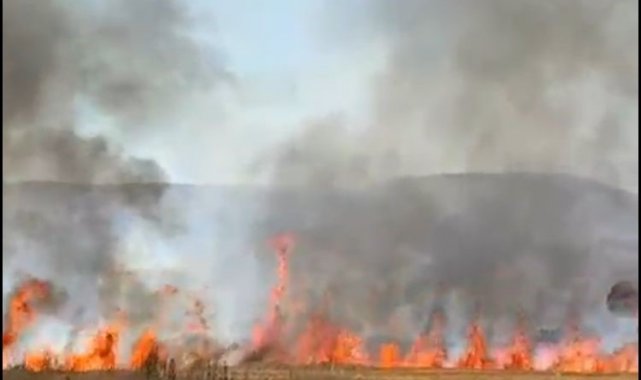 Traktörün kepçesinin elektrik tellerine temas etmesi ile çıkan yangında 50 dönüm arazi yandı