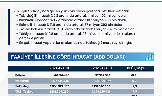 Açıklanan rakamlar, Trakya'da sanayi, tarım ve lojistik faaliyetlerinin yılın son ayında da dış ticarete güçlü katkı sunduğunu ortaya koyarken, özellikle Tekirdağ'ın ihracat hacmiyle bölge ekonomisindeki belirleyici rolünü sürdürdüğü değerlendirildi.