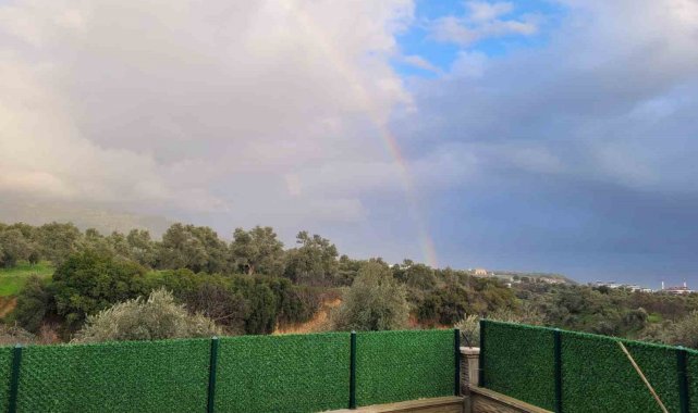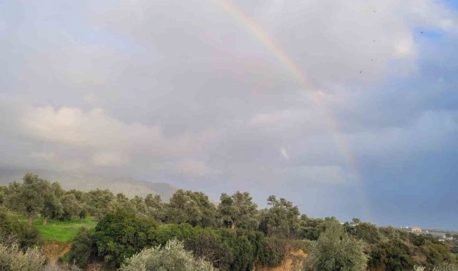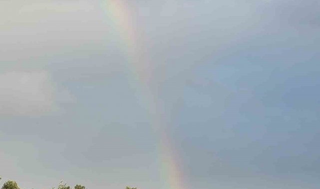 Aydın'ın Efeler ilçesinde etkili olan sağanak yağışın ardından ortaya çıkan gök kuşağı, gökyüzünde görsel şölen oluşturdu.