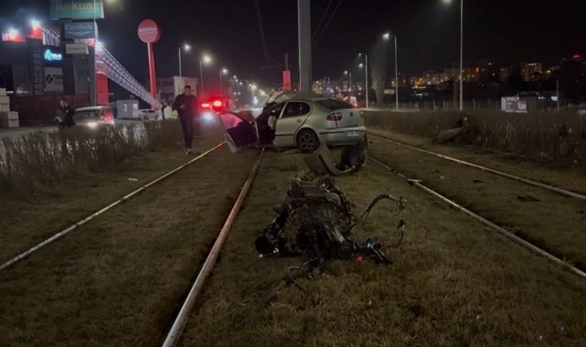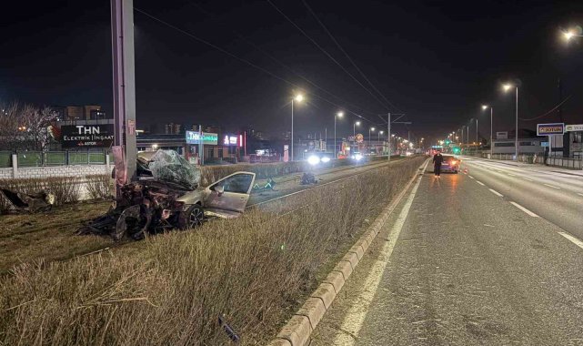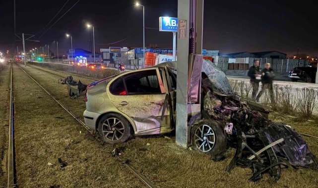 Tramvay yolundaki direğe çarpan otomobil kağıt gibi büküldü: 1 yaralı