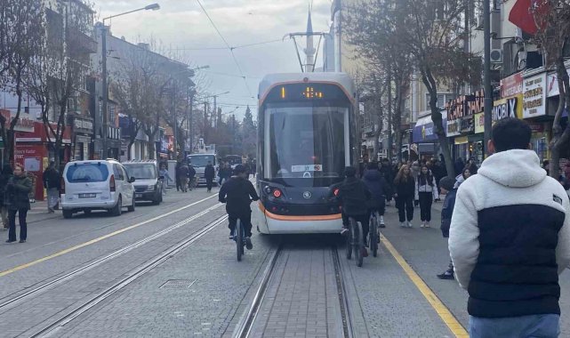 İki Eylül Caddesi üzerinde bir tramvayın arkasına tutunarak seyreden 3 bisikletli çocuk dikkat çekti. Yaşı küçük çocukların hareket halinde olan tramvayın peşinden giderken bisikletleriyle ön kaldırdıkları ve tehlikeli manevralar yaptığı görüldü. Muhtemel bir kaza yaşanmasından endişelenen çevredeki vatandaşlar çocukların düşüncesiz hareketlerine tepki gösterdi.