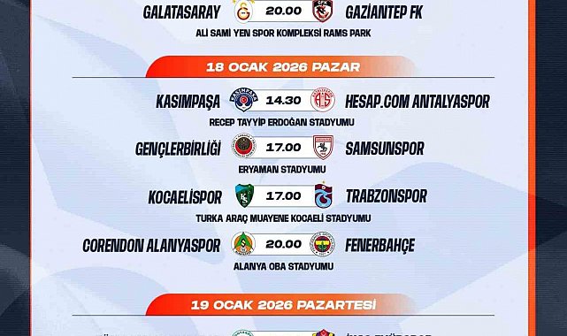 Trendyol Süper Lig'de 18. ve 19. haftalarda oynanacak müsabakaların programı belli oldu. TFF'nin sitesinden yapılan açıklamaya göre, söz konusu haftaların programı şu şekilde: