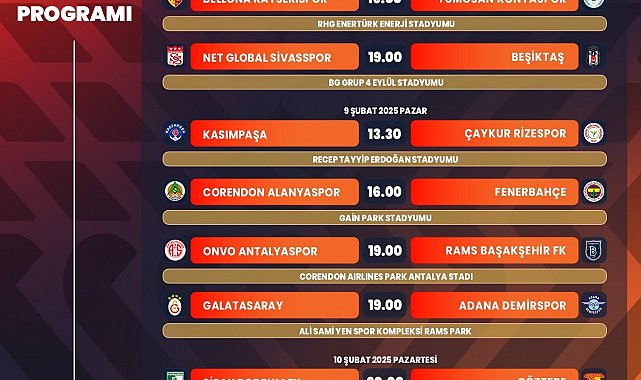 Yapılan açıklamada, "UEFA Avrupa Ligi'nde mücadele eden temsilcilerimizden, doğrudan Son 16 Turu'na yükselme ihtimali bulunan Galatasaray'ın bu ihtimalin gerçekleşmesi ve 23. hafta sonrasında UEFA Avrupa Ligi Play-Off maçının olmaması halinde, yayın programı doğrultusunda, Trabzonspor - Eyüpspor müsabakası 9 Şubat Pazar günü saat 19.00'a, Galatasaray - Adana Demirspor müsabakası ise 10 Şubat Pazartesi günü saat 20.00'ye alınacaktır" denildi.