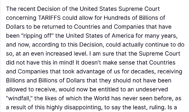 "On yıllarca bizden faydalanan, hak etmedikleri milyarlarca doları alan ülkelerin ve şirketlerin, bu son derece hayal kırıklığı yaratan karar sonucunda, dünyanın daha önce hiç görmediği türden hak edilmemiş bir 'beklenmedik kazanç' elde etme hakkına sahip olmaları mantıklı değil" değerlendirmesinde bulundu. Bu nedenle ABD Yüksek Mahkemesi'ni gümrük vergileri ile ilgili kararını gözden geçirmeye çağıran Trump, "Bu davanın yeniden görülmesi veya yeniden karara bağlanması mümkün mü?" diye sordu.