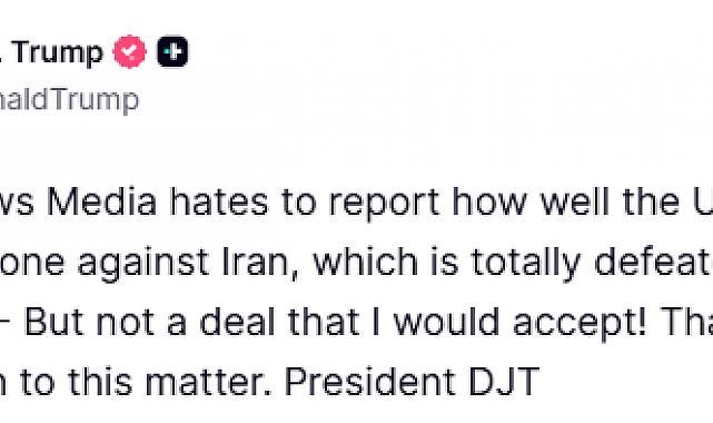 ABD Başkanı Donald Trump'tan İran'a karşı yürütülen savaşa dair bir açıklama daha geldi. Trump, Truth sosyal medya platformu üzerinden yayınladığı mesajda ABD basınına sitem ederek, "Yalan haber medyası, ABD ordusunun tamamen yenilgiye uğrayan ve bir anlaşma yapmak isteyen İran karşısında ne kadar başarılı olduğunu haber yapmaktan nefret ediyor" dedi. Trump, İran'ın istediğini öne sürdüğü anlaşma hakkında, "Ancak bu, benim kabul edeceğim türden bir anlaşma değil" ifadelerini kullandı.