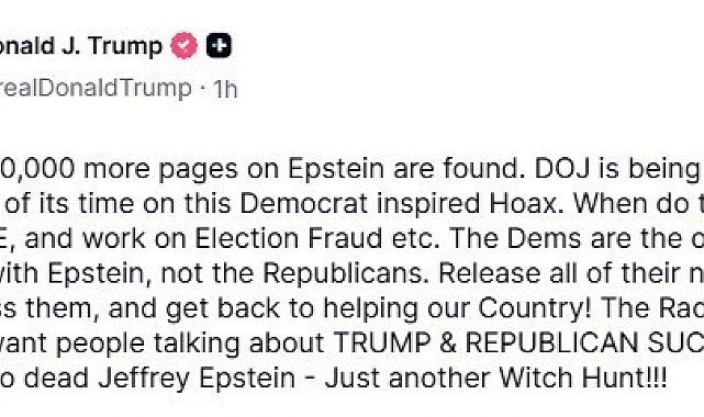 ABD Başkanı Donald Trump, ABD Adalet Bakanlığı'nın tüm zamanını "Epstein" belgelerine harcamak zorunda bırakıldığını ve Epstein ile ilişkisi bulunanların Cumhuriyetçiler değil, Demokratlar olduğunu belirterek, "Hepsinin isimlerini açıklayın, ifşa edin ve gerçekten ülkemize hizmet etmeye geri dönün" çağrısında bulundu.