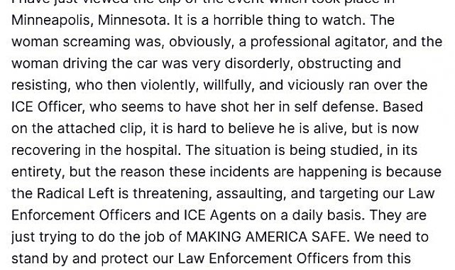 ABD Başkanı Donald Trump, ABD Göçmenlik ve Gümrük Muhafaza Dairesi (ICE) ajanlarının verilen emre uymayan ve aracıyla hareket eden bir kadını vurarak öldürmesi ile ilgili olarak, "Bu olayların yaşanmasının nedeni, radikal solun her gün kolluk kuvvetlerimizi ve ICE ajanlarımızı tehdit etmesi, onlara saldırması ve onları hedef almasıdır" açıklamasında bulundu.