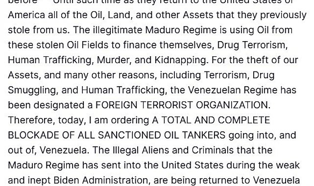 Nicolas Maduro rejiminin "gayrimeşru" olduğunu ve çalınmış petrol sahalarından elde edilen petrolü uyuşturucu terörizmi, insan kaçakçılığı, cinayet ve adam kaçırma faaliyetlerini desteklemek için kullandığını savunan Trump, "Varlıklarımızın çalınması başta olmak üzere, terörizm, uyuşturucu kaçakçılığı ve insan ticareti gibi pek çok gerekçe nedeniyle Venezuela rejimi, 'Yabancı Terör Örgütü' olarak tanımlanmıştır. Bu nedenle bugün, Venezuela'ya giren ve Venezuela'dan çıkan tüm yaptırıma tabi petrol tankerlerine tam ve kapsamlı bir abluka emri veriyorum" açıklamasında bulundu.