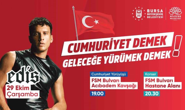 Bursa Büyükşehir Belediyesi ve Nilüfer Belediyesi tarafından 29 Ekim Çarşamba Günü düzenlenecek olan 'Cumhuriyet Yürüyüşü', on binlerce Bursalıyı Fatih Sultan Mehmet Bulvarı'nda buluşturuyor. Sevilen sanatçı Edis'in de sahne alacağı kutlamalarda, Cumhuriyet coşkusu doyasıya yaşanacak.