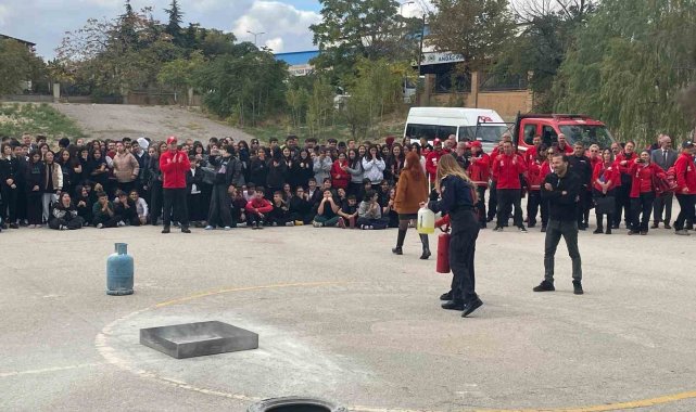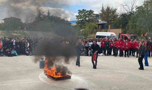 Okul bahçesinde toplanan öğrencileri, Ankara Büyükşehir İtfaiye ekipleri bilgilendirdikten sonra yangın söndürme tatbikatı gerçekleştirildi.