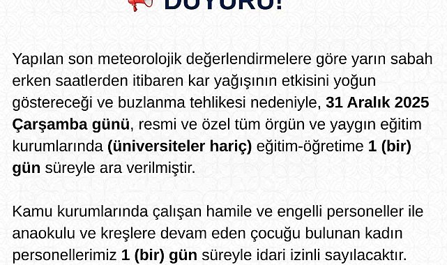 Tunceli Valiliği tarafından yapılan açıklamada, "Yapılan son meteorolojik değerlendirmelere göre yarın sabah erken saatlerden itibaren kar yağışının etkisini yoğun göstereceği ve buzlanma tehlikesi nedeniyle, 31 Aralık 2025 Çarşamba günü, resmi ve özel tüm örgün ve yaygın eğitim kurumlarında (üniversiteler hariç) eğitim-öğretime 1 gün süreyle ara verilmiştir. Kamu kurumlarında çalışan hamile ve engelli personeller ile anaokulu ve kreşlere devam eden çocuğu bulunan kadın personellerimiz 1 gün süreyle idari izinli sayılacaktır" ifadelerine yer verildi.