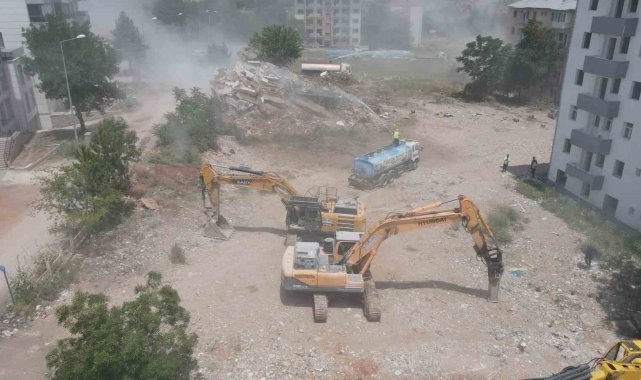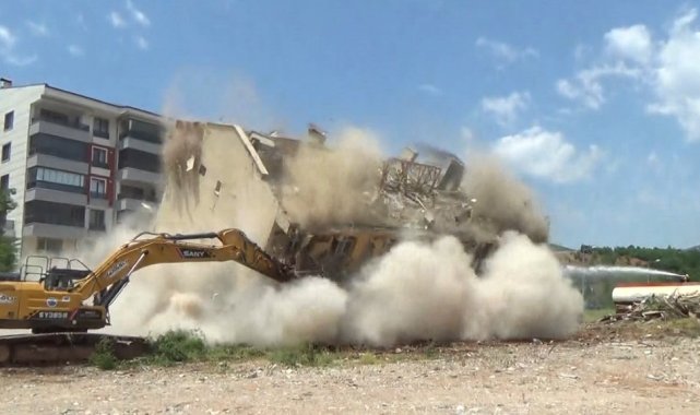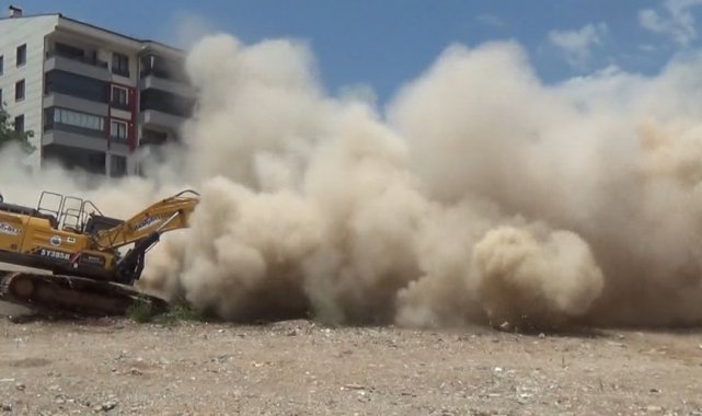 Çalışma alanında incelemelerde bulunan Vali Aygöl, iş makinesine binerek yıkım çalışması gerçekleştirdi. Yıkım esnasında bir binanın çökmesi etrafı tozla kapladı.