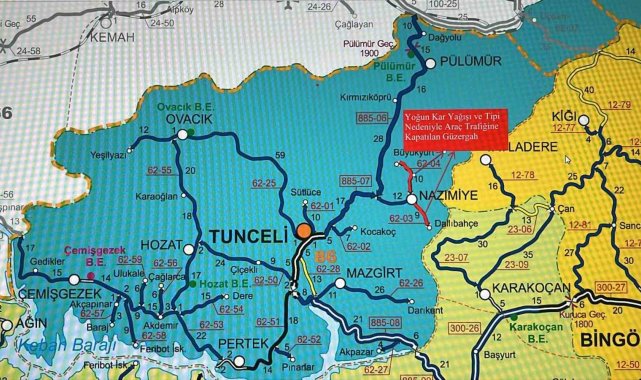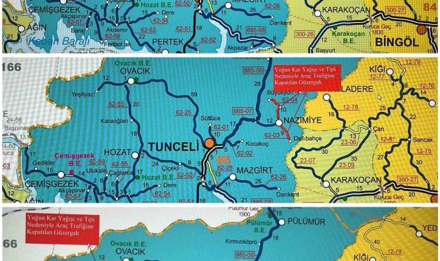 Tunceli'de etkili olan yoğun kar yağışı ve tipi, ulaşımda aksamalara yol açtı. Görüş mesafesinin ciddi şekilde azalması nedeniyle kent genelinde bazı il yolları güvenlik gerekçesiyle trafiğe kapatıldı. Bu kapsamda, 62-50 KK No'lu Tunceli-Hozat İl Yolunun 0-33 kilometreleri arası, yoğun kar yağışı ve tipi nedeniyle saat 16.30 itibarıyla araç trafiğine kapatıldı. Ayrıca, 62-03 KK No'lu Nazımiye-Dallıbahçe İl Yolunun 12-21 kilometreleri arası ile 62-04 KK No'lu Ayrım-Dereova İl Yolunun 0-10 kilometreleri arası, yoğun kar yağışı sebebiyle saat 15.35 itibarıyla ulaşıma kapatıldı. Bununla birlikte, 62-25 KK No'lu Tunceli-Ovacık-Yeşilyazı İl Yolunun 62-73 kilometreleri arası da yoğun kar yağışı ve tipi nedeniyle görüş mesafesinin kısıtlanması sonucu saat 16.30 itibarıyla araç trafiğine kapatıldı.