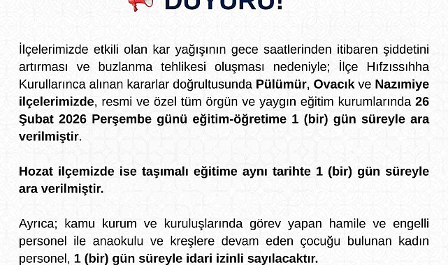 Valilikten yapılan açıklamada, "İlçelerimizde etkili olan kar yağışının gece saatlerinden itibaren şiddetini artırması ve buzlanma tehlikesi oluşması nedeniyle; İlçe Hıfzıssıhha Kurullarınca alınan kararlar doğrultusunda Pülümür, Ovacık ve Nazımiye ilçelerimizde, resmi ve özel tüm örgün ve yaygın eğitim kurumlarında 26 Şubat 2026 Perşembe günü eğitim-öğretime 1 (bir) gün süreyle ara verilmiştir. Hozat ilçemizde ise taşımalı eğitime aynı tarihte 1 (bir) gün süreyle ara verilmiştir. Ayrıca; kamu kurum ve kuruluşlarında görev yapan hamile ve engelli personel ile anaokulu ve kreşlere devam eden çocuğu bulunan kadın personel, 1 (bir) gün süreyle idari izinli sayılacaktır" ifadelerine yer verildi.