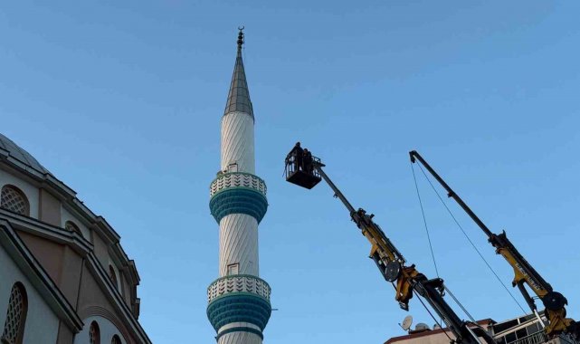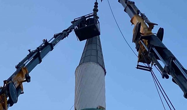 Turgutlu'da hasar gören cami minaresi vinçle düzeltildi