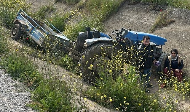 Manisa'nın Turgutlu ilçesinde ön lastiği çıkan traktörün takla atarak kanala savrulması sonucu 2 kişi yaralandı.