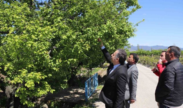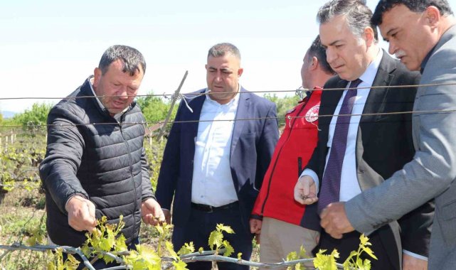 Manisa'nın Turgutlu ilçesinde Kaymakam Selami Kapankaya ve beraberindeki heyet don afetinin etkili olduğu tarım arazilerinde incelemelerde bulunarak çiftçilerden bilgi aldı.