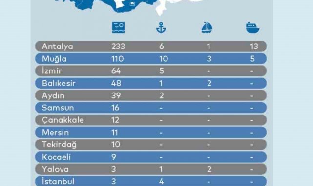 Turizm tekneleri kategorisinde ise Antalya, 13 tekneyle birinci oldu