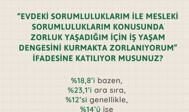 'Evdeki sorumluluklarım ile mesleki sorumluluklarım konusunda zorluk yaşadığım için iş yaşam dengesini kurmakta zorlanıyorum' ifadesine katılıyor musunuz? sorusuna yüzde 32,1'i hiçbir zaman, yüzde 18,8'i bazen, yüzde 23,1'i ara sıra, yüzde 12'si genellikle, yüzde 14'ü ise her zaman cevabı vermiştir.