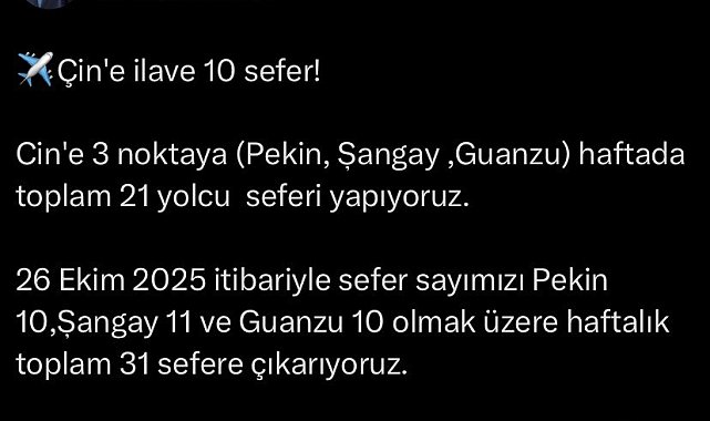 Türk Hava Yolları, Çin'e yaptığı uçuş sayısını artırıyor. Pekin, Şanghay ve Guanzu'ya haftada toplam 21 sefer düzenleyen THY, 26 Ekim 2025 itibarıyla bu sayıyı 31'e çıkaracak.