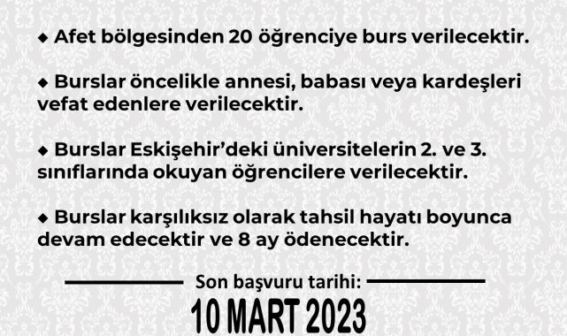 Kahramanmaraş merkezli depremlerden etkilenen afetzedeler için ülke genelindeki sivil toplum kuruluşları da seferber oldu. Türk Ocakları Eskişehir Şubesi, afet bölgesinden 20 öğrenciye burs verileceğini açıkladı. Açıklamanın detaylarında; burslarda öncelikli olarak annesi, babası veya kardeşleri vefat eden Eskişehir'de öğrenim gören ikinci ve üçüncü sınıf öğrencilerine verileceği belirtildi. Bursların karşılıksız olarak öğrenim hayatı boyunca 8 ay ödeneceği bildirildi. Son başvuru tarihi ise 10 Mart 2023 olarak açıklandı.