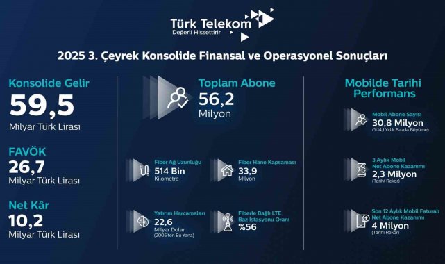 Türk Telekom'un 2025 üçüncü çeyrek itibarıyla toplam abone sayısı 56,2 milyon olurken, Türkiye'nin her köşesinde yüksek hızlı internet sunma amacıyla sürdürdüğü çalışmaların sonucunda, fiber ağının uzunluğu 514 bin kilometreye, fiber hane kapsaması 33,9 milyona ve 5G için kritik öneme sahip fiberle bağlı LTE baz istasyonu oranı yüzde 56'ya yükseldi. Mobil alanda tarihin en iyi çeyrek performansını sergileyen şirket, 2,3 milyon net abone kazanımıyla mobil abone sayısını 30,8 milyona yükseltti.