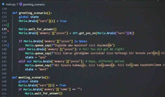 Moria'da birçok farklı mod olduğunu kaydeden Adar, etkileşime göre tepki verdiğini söyleyerek, "Robotumuz 'serbest mod' dediğimiz bir modda çalışıyor. Bu moddayken etrafını inceliyor ve bir insan olup olmadığını kontrol ediyor. Eğer bir insanla karşılaşıyorsa 'sosyal mod' açılıyor ve karşısındaki kişiye 'merhaba ben Moria' diye kendini tanıtıp karşı taraftan cevap bekliyor. Karşı taraftan aldığı cevaba göre karşı tarafı tanıyıp tanımadığını kontrol ediyor. Daha önceden tanıdığı bir kişi ise ismi ile hitap ediyor. Eğer tanımadığı bir kişi ise bu durumda 'tanışma modu' açılıyor. Bu modda kişinin ismini soruyor, bir adet fotoğraf çekip hafızaya kaydediyor. Bir sonraki soruya cevaplar üretiyor. Burada yapay zeka, görüntü işleme ve farklı algoritmalardan destek almış bulunmaktayız. Şu anki geliştirdiğimiz platformda robotumuz karşı tarafın sorusunu dinleyip sonra cevap oluşturuyor. Kendisi konuşurken siz devreye girerseniz konuştuğunuzu dinlemiyor. Bunun üzerine çalışmalarımızı sürdürüyoruz" dedi.