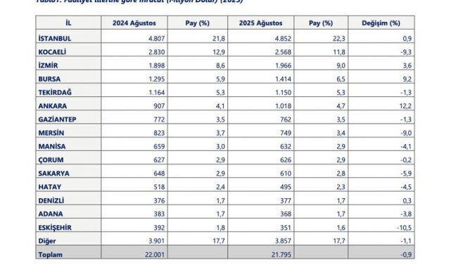 Ticaret Bakanlığı, ağustos ayına ve yılın 8 aylık dönemine ilişkin faaliyet illerine göre ihracat verilerini açıkladı. Buna göre İstanbul, geçen ay 4 milyar 852 milyon dolarla en fazla ihracat yapan il oldu. Kentin ihracatı geçen yılın aynı ayına göre yüzde 0,9 artış gösterdi. İstanbul'u yüzde 9,3 azalış ve 2 milyar 568 milyon dolar ile Kocaeli, yüzde 3,6 artış ve 1 milyar 966 milyon dolar ile İzmir takip etti. 2025 yılı Ağustos ayında ihracatta ilk beşte yer alan iller ise sırasıyla 4 milyar 852 milyon dolarla İstanbul, 2 milyar 568 milyon dolarla Kocaeli, 1 milyar 966 milyon dolarla İzmir, 1 milyar 414 milyon dolarla Bursa ve 1 milyar 150 milyon dolarla Tekirdağ oldu.