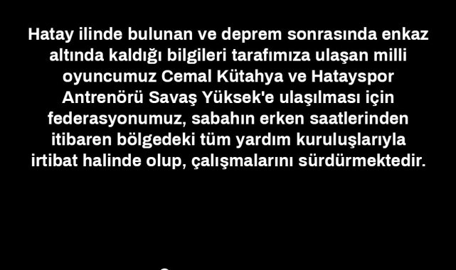 Türkiye Hentbol Federasyonu (THF) sosyal medya hesabından konuyla ilgili yapılan paylaşımda, "Hatay ilinde bulunan ve deprem sonrasında enkaz altında kaldığı bilgileri tarafımıza ulaşan milli oyuncumuz Cemal Kütahya ve Hatayspor Antrenörü Savaş Yüksek'e ulaşılması için federasyonumuz, sabahın erken saatlerinden itibaren bölgedeki tüm yardım kuruluşlarıyla irtibat halinde olup, çalışmalarını sürdürmektedir" denildi