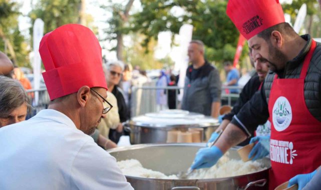 Edirne'de düzenlenen festivalde Türkiye'nin en büyük tenceresinde pişirilen 6 ton rekor miktardaki pirinç pilavı, vatandaşlara ikram edildi.