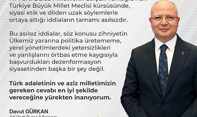 AK Parti Bursa İl Başkanı Davut Gürkan, İYİ Parti Bursa Milletvekili Selçuk Türkoğlu'nun dün meclis kürsüsünde yaptığı konuşmada ortaya attığı fatura iddialarının gerçeği yansıtmadığını belirterek, "Selçuk Türkoğlu'nun Türkiye Büyük Millet Meclisi kürsüsünde, siyasi etik ve dilden uzak söylemlerle ortaya attığı iddiaların tamamı asılsızdır" dedi.