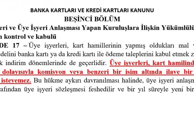 "Üye işyerleri, kart hamillerinin yapmış oldukları mal ve hizmet alımlarının bedelini banka kartı ya da kredi kartı ile ödeme taleplerini kabul etmek zorundadır. Bu zorunluluk indirim dönemlerinde de geçerlidir. Üye işyerleri, kart hamilinden kartın kullanılması dolayısıyla komisyon veya benzeri bir isim altında ilave bir ödemede bulunmasını isteyemez. Bu hükme aykırı davranılması halinde, üye işyeri anlaşması yapan kuruluşlar tarafından üye işyeri sözleşmesi feshedilir ve bir yıl süreyle yeni bir sözleşme yapılamaz".