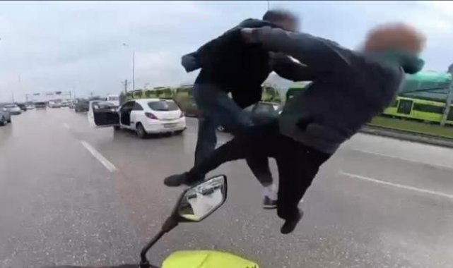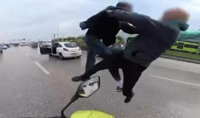 Bursa-İzmir yolu üzerinde 'yol verme' meselesi nedeniyle iki sürücü arasında tartışma çıktı. Araçlarından inen taraflar birbirlerine uçan tekmeyle saldırdı. Korku dolu anlar kameraya yansırken, tarafları yoldan geçen kurye ve çevredeki sürücüler ayırdı. Görüntüler üzerine harekete geçen Bursa İl Emniyet Müdürlüğü ekipleri, kavga eden sürücülerin Serkan K. ile Emirhan A. olduğunu tespit etti. İki sürücü gözaltına alındı. Polis ekiplerince sürücülere toplamda 13 bin lira idari ceza uygulandı.