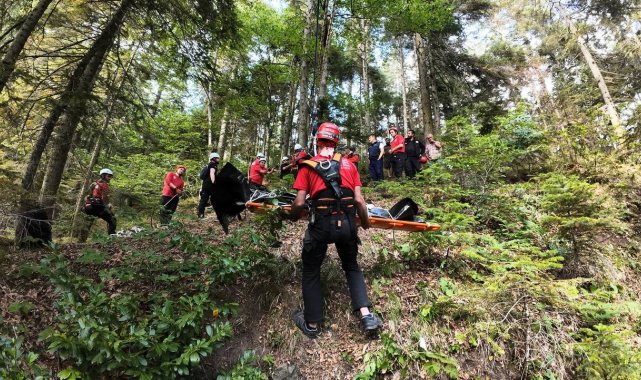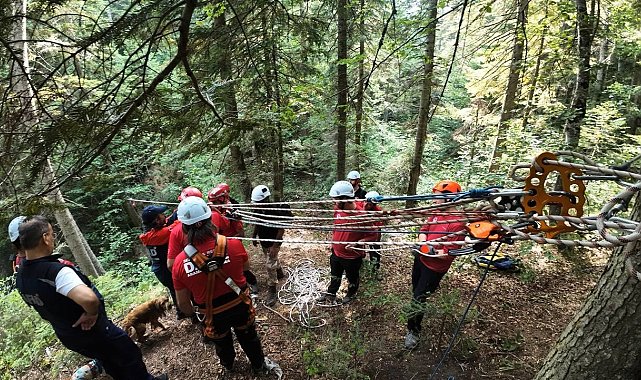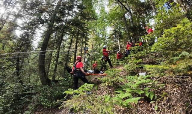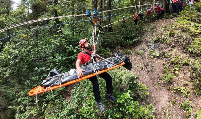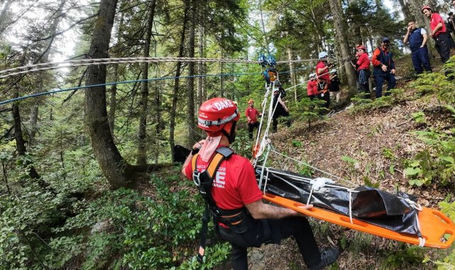 Eğitimin ardından ise yamaçtan aşağı düşen yaralı ip tekniği kullanılarak kurtarıldı.