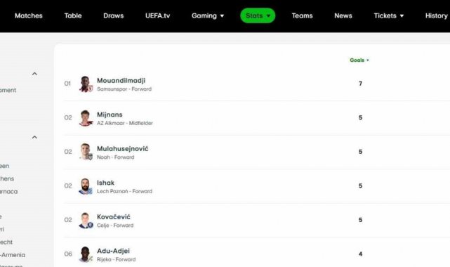 Kuzey Makedonya ekibi Shkendija'yı eleyerek Konferans Ligi'nde son 16 takım arasına adını yazdıran Samsunspor, bireysel performanslar ile de öne çıkıyor. Samsun ekibinde 8 maçta 7 gol atan Marius Mouandilmadji, en yakın rakibinin 2 gol önünde gol krallığında zirvede yer alıyor. Dün Shkendija filelerini de 2 kez sarsan Mouandilmadji'nin en yakın takipçileri ise 5'er golle AZ Alkmaar'dan Sven Mijnans, Noah'tan Nardin Mulahusejnovic, Lech Poznan'dan Mikael Ishak ve Ferencvaros'tan Franko Kovacevic.