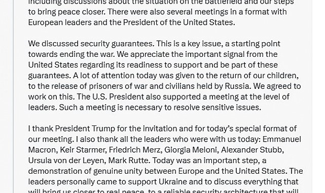 Beyaz Saray'daki görüşmelere ev sahipliği yaptığı için ABD Başkanı Donald Trump'a teşekkür eden Zelenskiy, "Ayrıca bizimle olan tüm liderlere de teşekkür ederim: Emmanuel Macron, Keir Starmer, Friedrich Merz, Giorgia Meloni, Alexander Stubb, Ursula von der Leyen, Mark Rutte. Bugün önemli bir adımdı ve Avrupa ile ABD arasındaki gerçek birliğin göstergesiydi" ifadelerini kullandı. Tüm liderlerin Ukrayna'yı desteklemek, gerçek barışa giden yolu açmak ve Avrupa'nın güvenliğini sağlamak için görüşmelere katıldığını hatırlatan Zelenskiy, "Çalışmalarımızı sürdürüyoruz. Bu savaşı onurlu bir şekilde sona erdirmeyi amaçlayan tüm müttefiklerle adımlarımızı koordine ediyoruz. Yardım eden herkese teşekkür ederim" dedi.