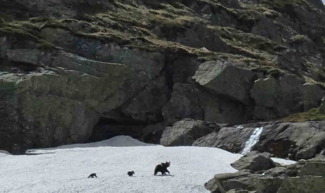 Mevsimlerin kayması sebebiyle havaların geç ısındığı hatta karın hala erimediği zirvede kış uykusunu tamamlayıp kaldıkları mağaradan çıkan anne ayı ve 2 yavrusu yiyecek ararken görüntülendi. Ayı ailesi bir süre sonra gözden kayboldu.