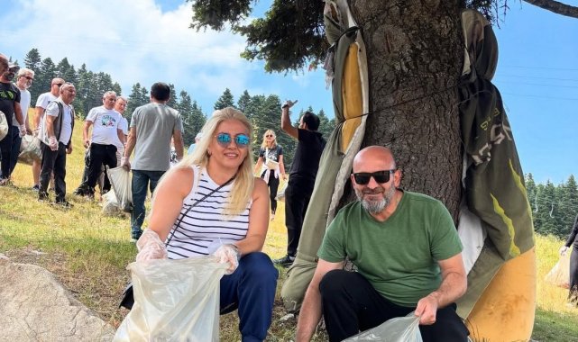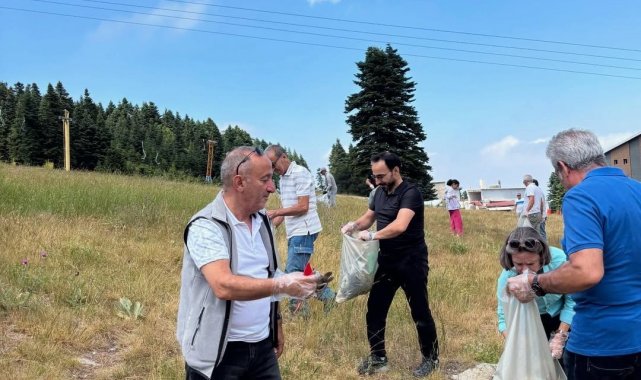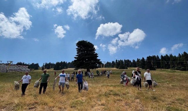 Uludağ'da yangın riskine karşı her taşın altını temizleyen kayak öğretmenleri ve aileleri, 30 poşet çöp ve 2 konteyner atık topladı.