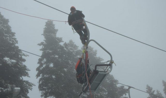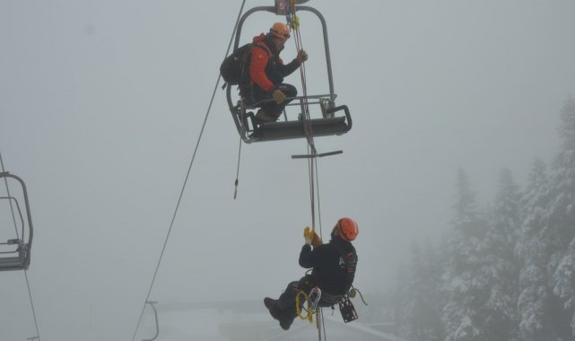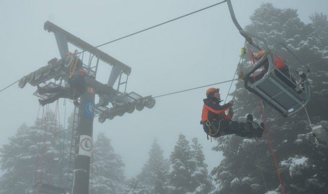 Kış turizminin gözde merkezlerinden Uludağ'de sezon hazırlıkları sürüyor. Uludağ'ın zorlu kış şartlarında teleferik ve telesiyejlerde mahsur kalma ihtimaline yönelik kar yağışı altında yapılan tatbikat, gerçeği aratmadı.