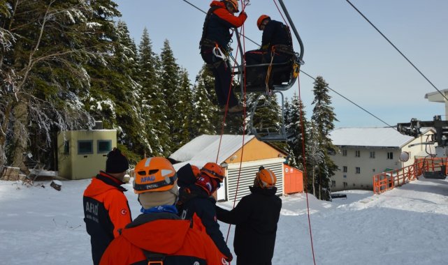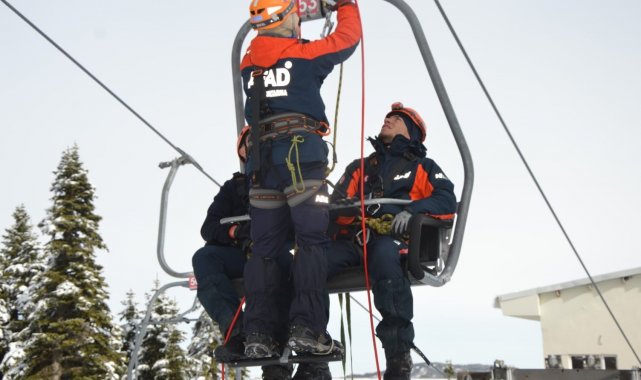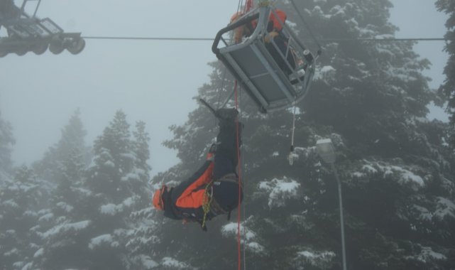 Bursa'da AFAD ve JAK ekipleri, Uludağ'da gerçekleştirdikleri kurtarma tatbikatında yürekleri ağza getirdi. Uludağ'ın karla kaplı bölgesinde 35 AFAD ve 2 tim JAK ekibi, duran telesiyejdeki kişileri sağlıklı bir şekilde yere indirmek için akrobatları aratmayacak şekilde tellerde ilerledi. Mahsur kalanlara ulaşan ekipler, onları sağlıklı bir şekilde indirmek için gereken bütün önlemleri aldı.