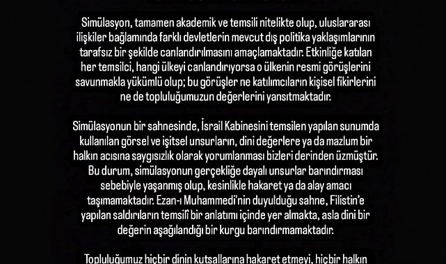"Uludağ Üniversitesi Hukuk Fakültesi bünyesinde faaliyet gösteren Temyiz Topluluğu olarak, düzenlediğimiz Diplomasi Simülasyonu kapsamında kamuoyunda oluşan yanlış algılara ve gündeme gelen tepkilere yönelik açıklama yapma ihtiyacı doğmuştur. Simülasyon, tamamen akademik ve temsili nitelikte olup, uluslararası ilişkiler çerçevesinde farklı devletlerin mevcut dış politika yaklaşımlarının tarafsız bir şekilde canlandırılmasını amaçlamaktadır. Etkinliğe katılan her temsilci, hangi ülkeyi canlandırıyorsa o ülkenin resmi görüşlerini savunmakla yükümlü olup; bu görüşler ne katılımcıların kişisel fikirlerini ne de topluluğumuzun değerlerini yansıtmaktadır. Simülasyonun bir sahnesinde, İsrail Kabinesini temsilen yapılan sunumda kullanılan görsel ve işitmeyle ilgili unsurların, dini değerlere ya da mazlum bir halkın acısına saygısızlık olarak yorumlanması bizleri derinden üzmüştür. Bu durum, simülasyonun gerçekliğe dayalı unsurlar barındırması sebebiyle yaşanmış olup, kesinlikle hakaret ya da alay amacı taşımamaktadır. Ezan-i Muhammedi'nin duyulduğu sahne, Filistin'e yapılan saldırıların temsili bir anlatımı içinde yer almakta, asla dini bir değerin aşağılandığı bir kurgu barındırmamaktadır. Topluluğumuz hiçbir dinin kutsallarına hakaret etmeyi, hiçbir halkın yaşadığı acıyı küçümsemeyi tasvip etmez ve böyle bir niyetle hareket etmemiştir. Tüm bu temsiller yalnızca diplomatik pozisyonları daha iyi anlayabilmek adına hazırlanmıştır. Yaşanan yanlış anlamadan dolayı üzüntümüzü ifade ediyor, açıklamamızın kamuoyuna bir açıklık getirmesini temenni ediyoruz."