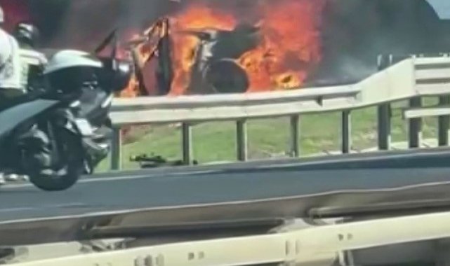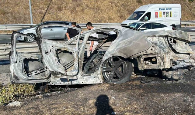 Olay, saat 16.00 sıralarında Çamlık Kavşağı'nda meydana geldi. İddiaya göre, trafikte ilerleyen 35 CPH 179 plakalı BMW marka otomobil, sürücüsünün kontrolünden çıkıp bariyerleri aşarak refüjde durdu. Sürücü kendini dışarı atarken, kaza sonrası otomobil alev topuna döndü. Durumun bildirilmesi üzerine olay yerine çok sayıda itfaiye ekibi sevk edildi. Alev alev yanan otomobil itfaiye ekiplerinin çalışmasıyla söndürüldü. Otomobil hurdaya dönerken, olayla ilgili inceleme başlatıldı.